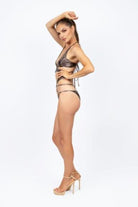 Crafted with meticulous attention to detail, the Night Two-Piece Swimsuit features a luxurious metallic gunmetal silver hue that exudes opulence. The intricate strappy framework adds a touch of sophistication, creating a Swimsuit that is both stylish and unique. Whether you're lounging by the pool or strolling along the beach, this swimsuit ensures you stand out with radiant confidence.