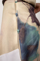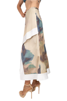 The wrap-style silhouette, enhanced by an artistic watercolor pattern, evokes the essence of modern elegance, blending fluidity with a bold statement. A discreet covered button side closure adds a subtle yet striking detail, elevating this design to new heights of couture-inspired finesse.