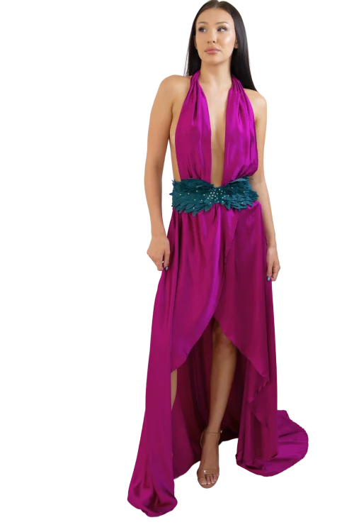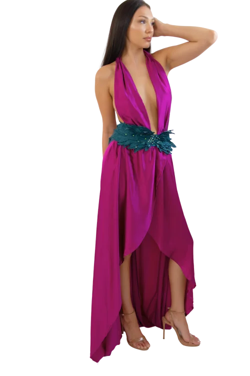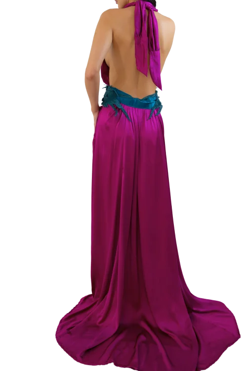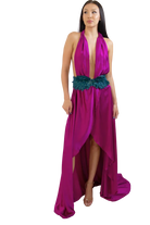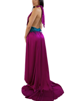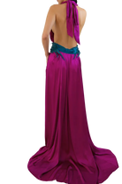 Unveil a vision of luxury with the Lucid Evening Gown, designed for the sophisticated woman who dares to stand out. Crafted from 100% Silk Charmeuse, this gown offers a flawless fit and a sensual drape. The striking magenta hue, paired with sophisticated petroleum green accents, exudes an air of confidence and modern allure.