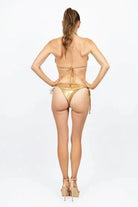 Experience the allure of timeless luxury with the Boissiere Bikini. Featuring a chic triangle top that transforms effortlessly from a crisscross halter to a classic halter style, this bikini offers two versatile looks in one stunning piece. Available in radiant metallic gold, it is designed to complement every skin tone beautifully.