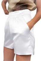Poly satin shorts,High-waist satin shorts,Elegant summer shorts,Luxury casual shorts,White satin shorts,Black satin shorts,Gold satin shorts,Sophisticated high-waist shorts