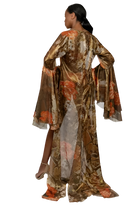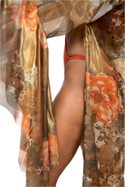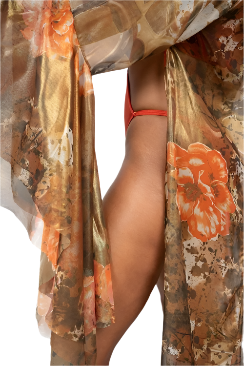 Exude sophistication and allure with the Wanting Cover Up, a stunning piece designed for the modern woman who commands attention. Crafted from luxurious metallic silk chiffon, this cover-up features a vibrant orange floral abstract design that radiates extravagance. Its classic, elegant silhouette is complemented by dramatic layered bell sleeves, adding an element of whimsical sophistication.